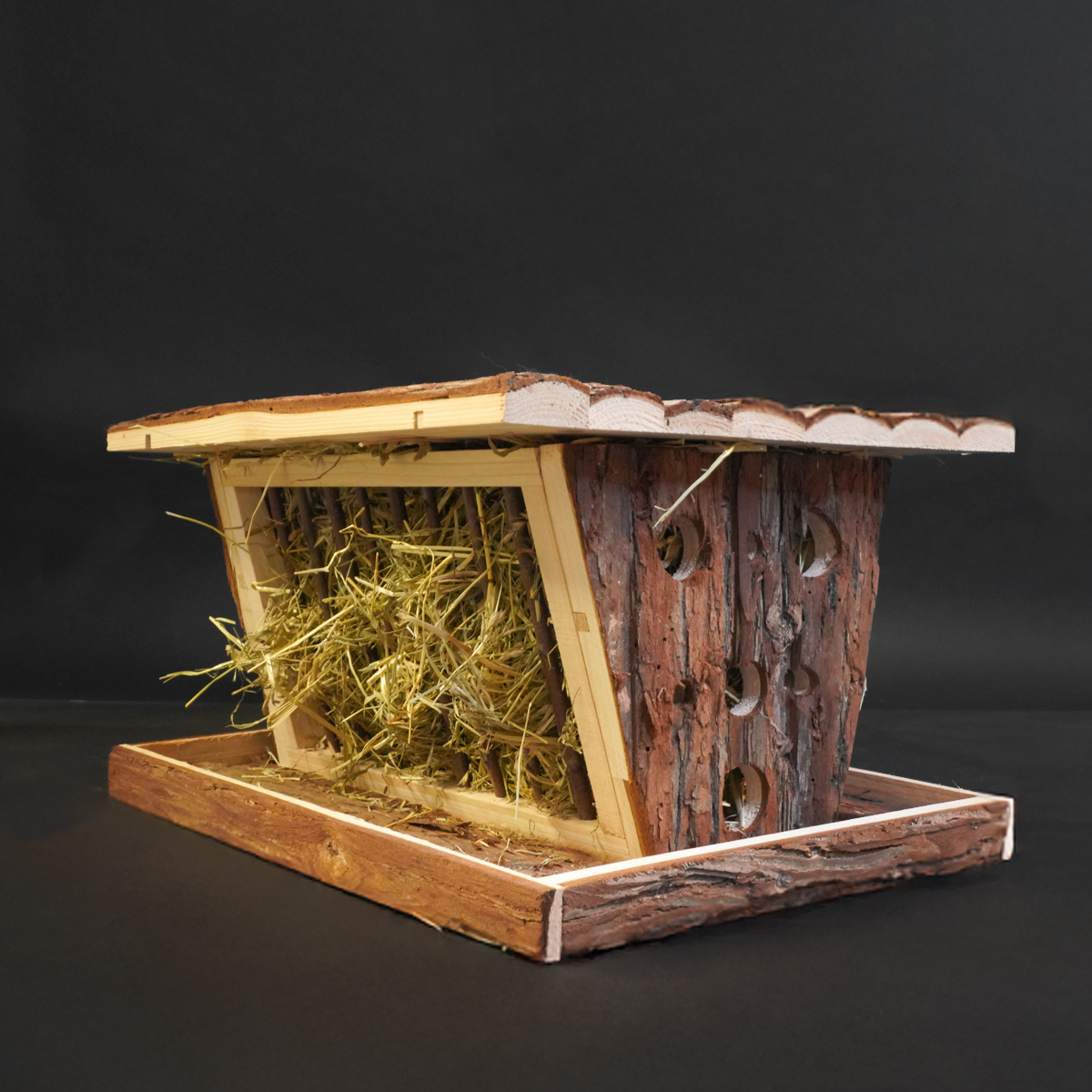 Makkelijk te vullen met hooi via de klep aan de bovenzijde.