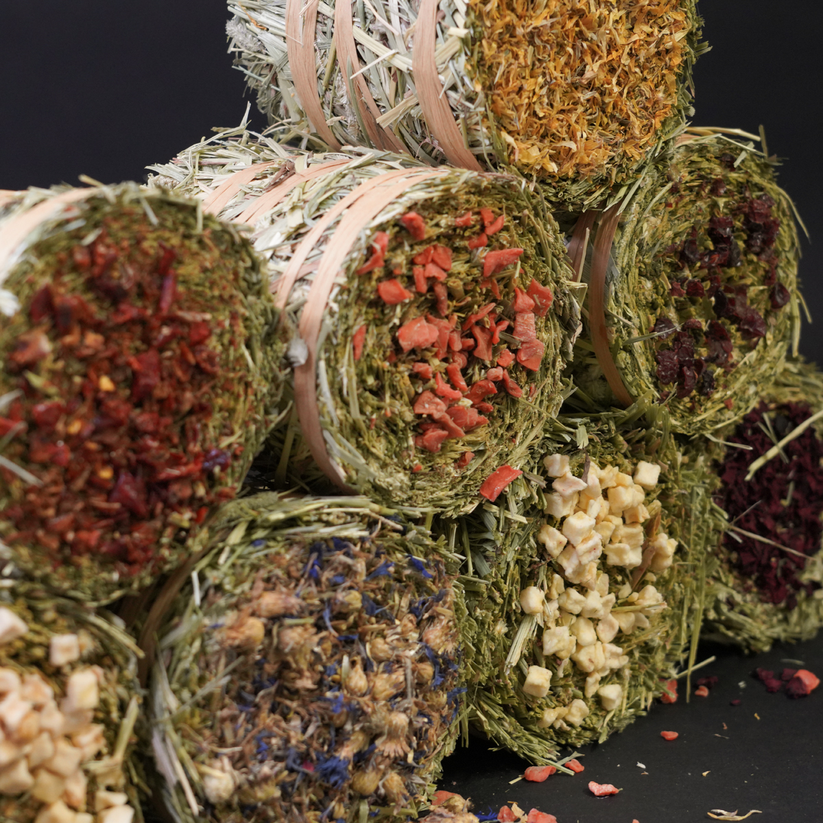 In deze set van 8 Hay cakes vind je alle 8 de verschillende smaken! Toppings met appel, blauwe korenbloem, goudsbloem, pastinaak, rode biet, rode paprika, rozenbottel en wortel.