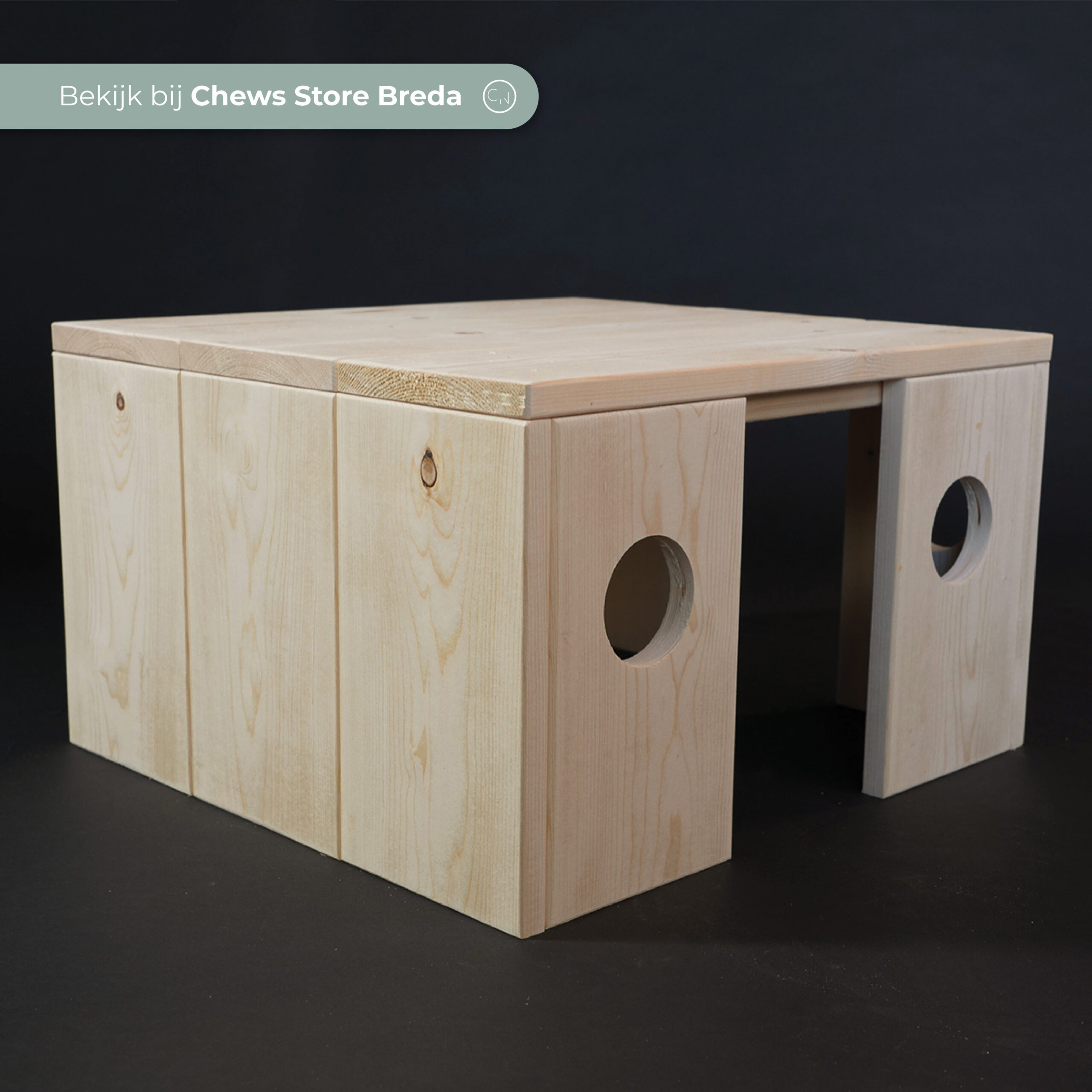 Schuilhuis Heimdall is een handgemaakt houten schuilplek voor jouw cavia! Door het strakke, neutrale uiterlijk past deze mooie schuilplek perfect in het verblijf van jouw cavia. Dit schuilhuis heeft 2 openingen, waardoor veel cavia’s dit huis prettiger ervaren als een schuilplek met 1 opening. Het onbewerkte hout is veilig voor jouw knager.