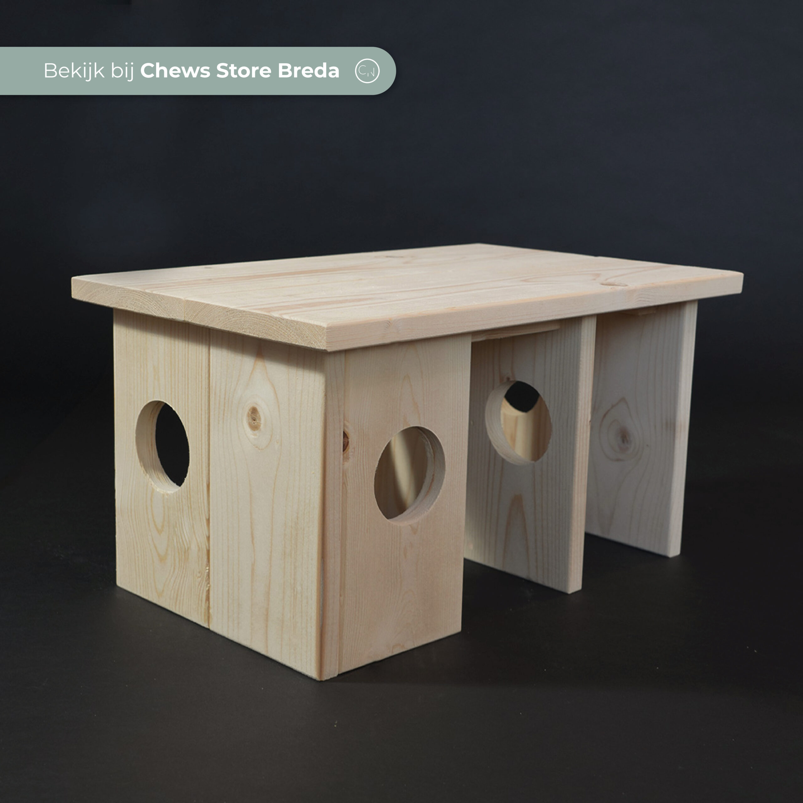 Schuilplek Ymir is een handgemaakt houten schuilplek voor jouw cavia! Door het strakke, neutrale uiterlijk past deze mooie schuilplek perfect in het verblijf van jouw cavia. Deze schuilplek heeft meerdere openingen, waardoor veel cavia’s dit huis prettiger ervaren als een schuilplek met 1 opening. Door de extra tunnel aan schuilplek Ymir kan je cavia nóg meer ontdekken, spelen en rondjes rennen. Het onbewerkte hout is veilig voor jouw knager.