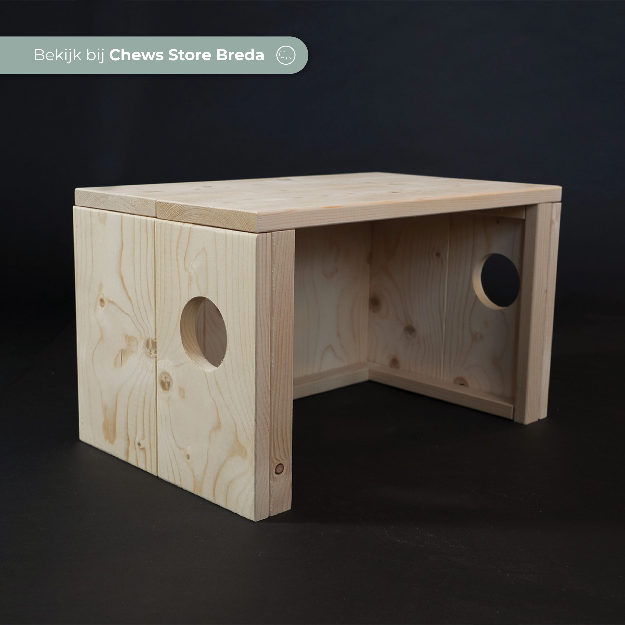 Schuilschuur Heimdall is een handgemaakt houten schuilplek voor jouw cavia! Door het strakke, neutrale uiterlijk past deze mooie schuilplek perfect in het verblijf van jouw cavia. Het onbewerkte hout is veilig voor jouw knager.