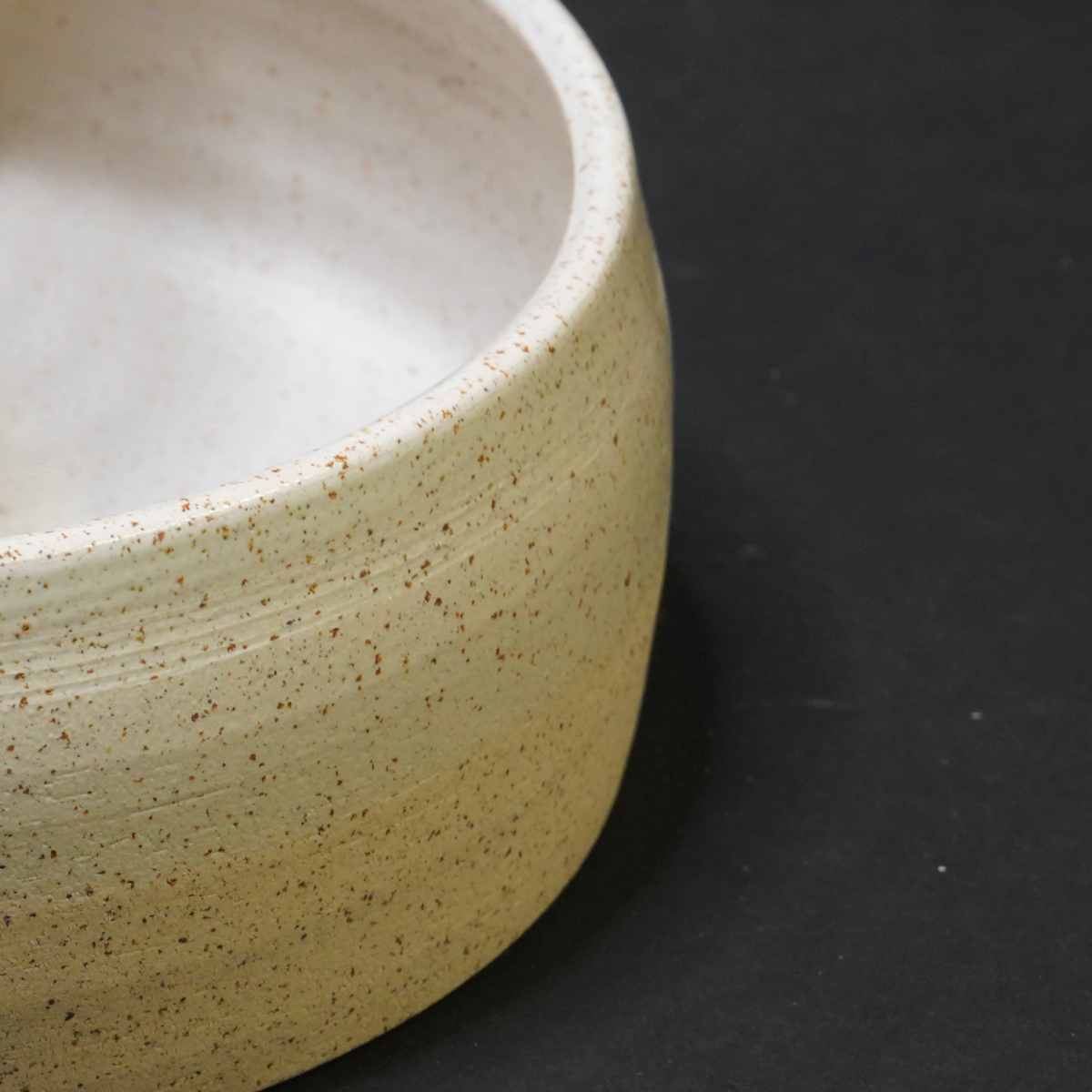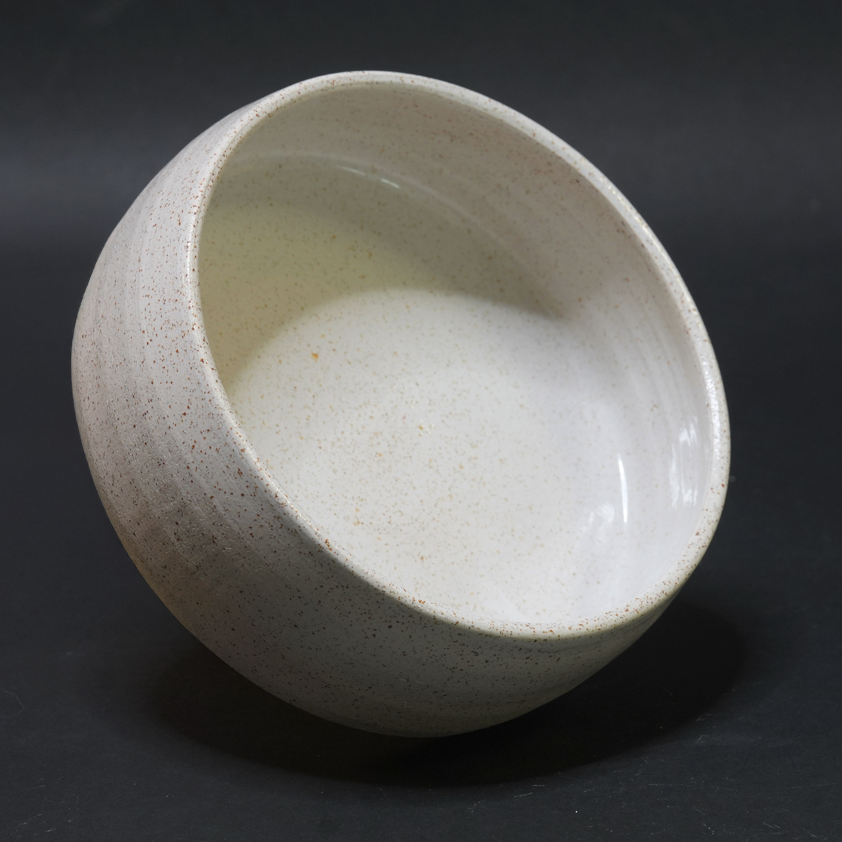 De eet- en drinkbak is gedraaid van een spikkelklei en voorzien van een wit glazuur.