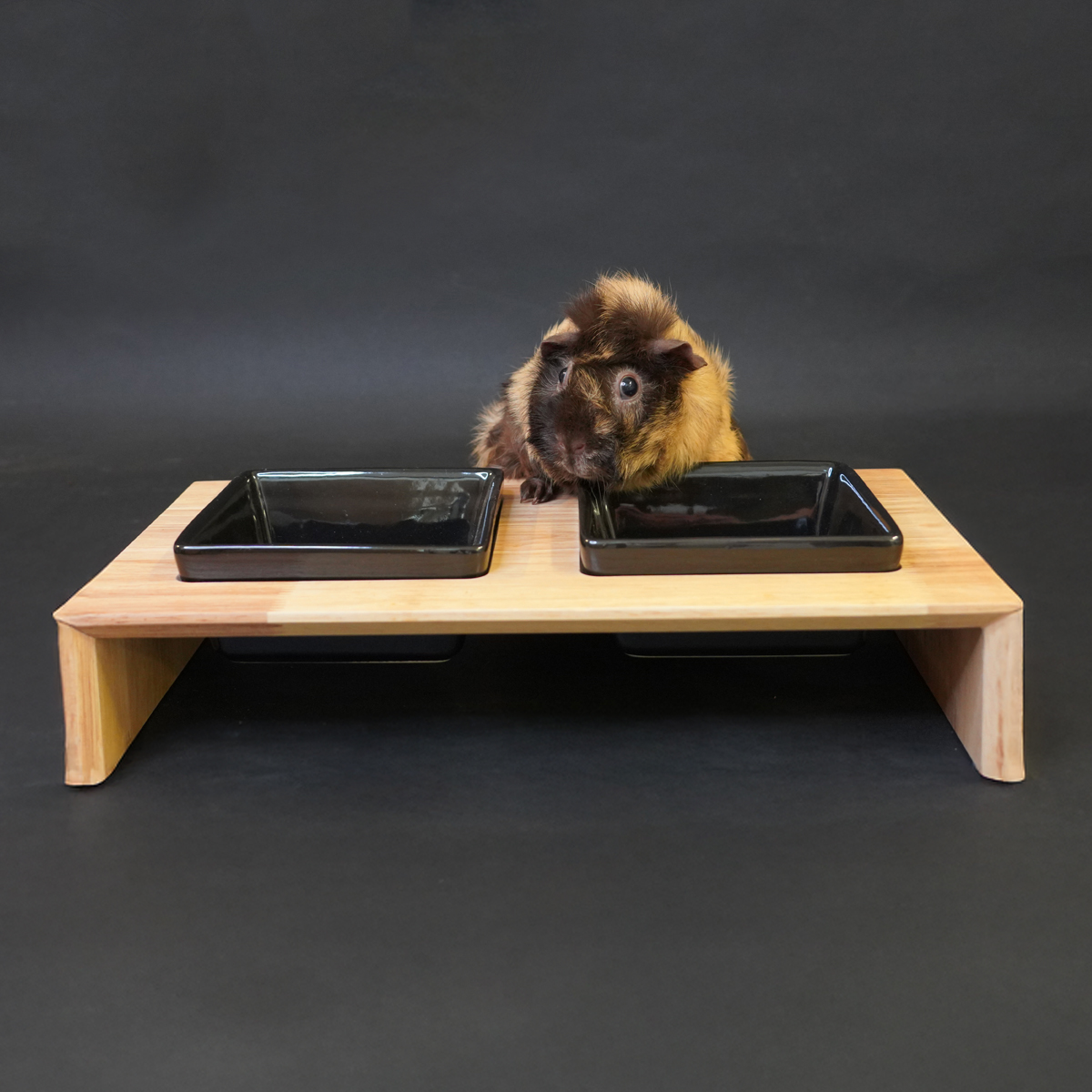 Geef jouw cavia een prachtige plek om te eten en drinken! Deze Food station heeft 2 keramieken, zwarte bakjes in een houten plateau. De bakjes zijn stevig en vrij zwaar, waardoor jouw cavia er niet zomaar mee kan gooien. En dankzij de verhoging komt er ook minder snel bodembedekking, hooi of andere viezigheid in de bakjes.