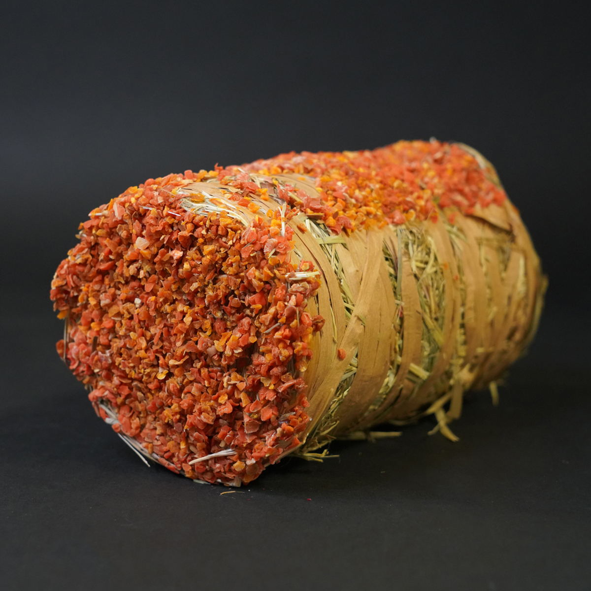Deze smakelijke rol bestaat uit geurend hooi, aangevuld met een wortel en pompoen voor een extra lekkere en voedzame twist.