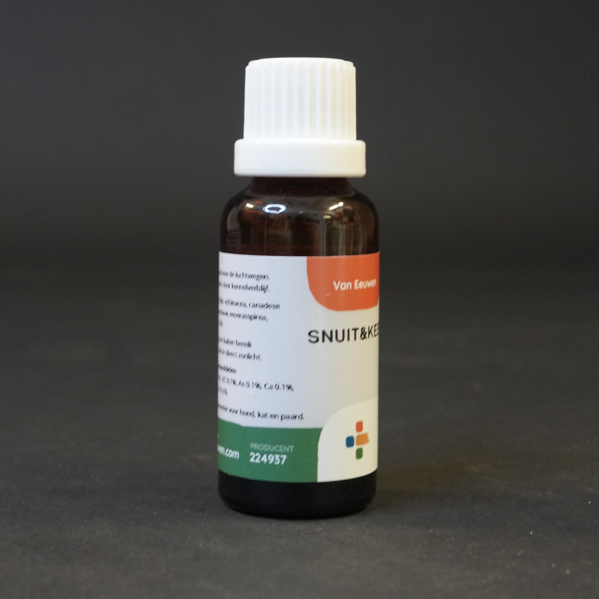 Snuit & keel van Van Eeuwen is een hulpmiddel ter ondersteuning bij de conditie van de voorste luchtwegen, bij aandoeningen van de slijmvliezen van de voorste luchtwegen, die gepaard gaan met hoesten.