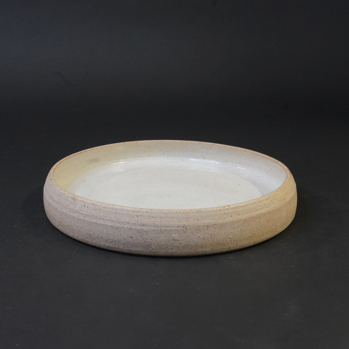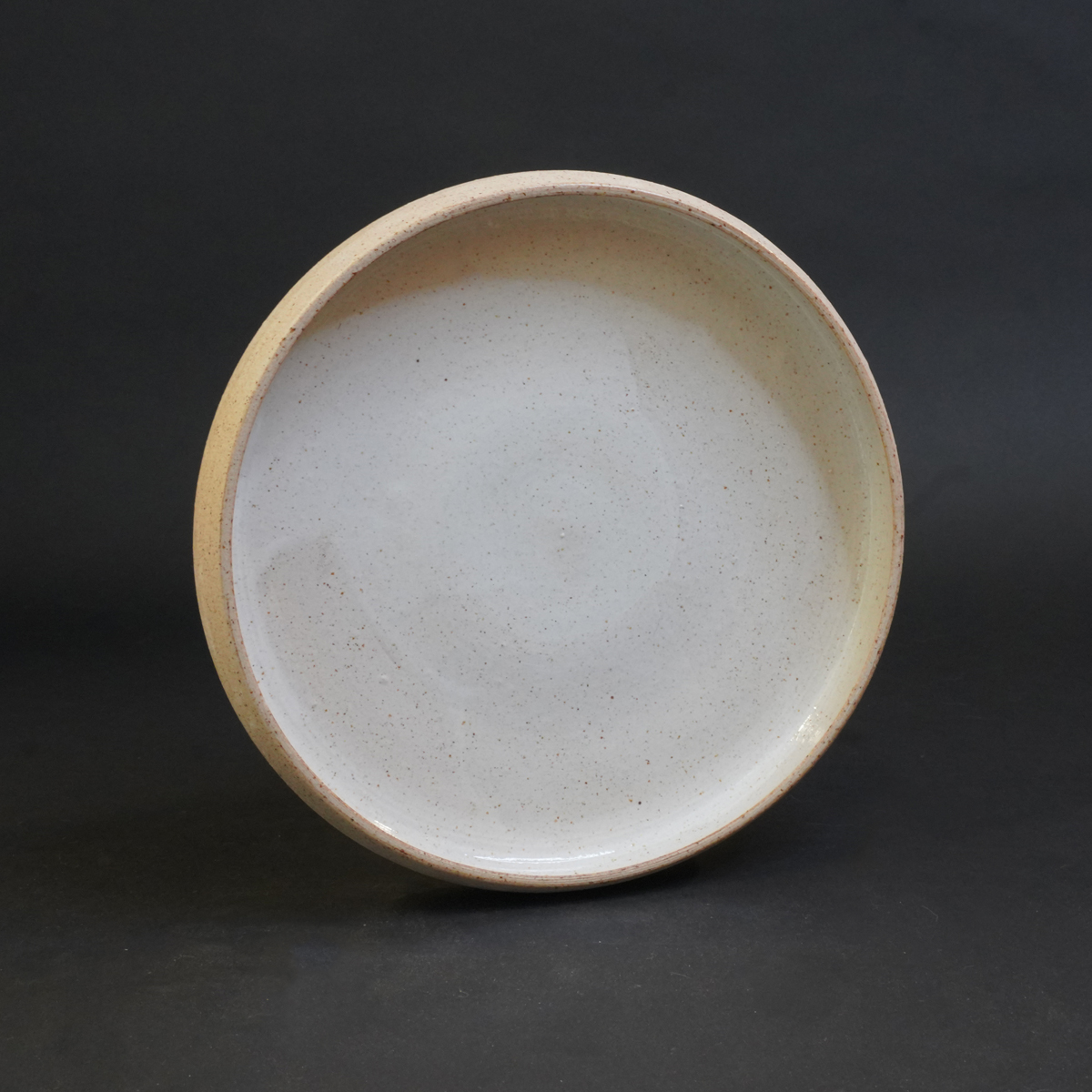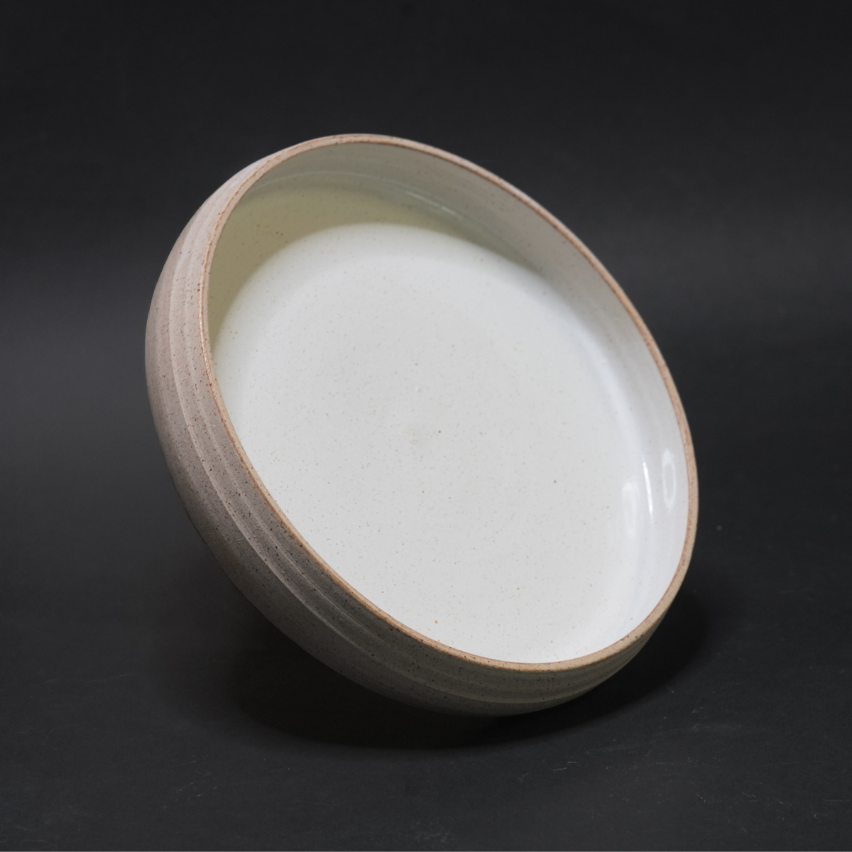 De kruidenschaal is gedraaid van een spikkelklei en voorzien van een wit glazuur.