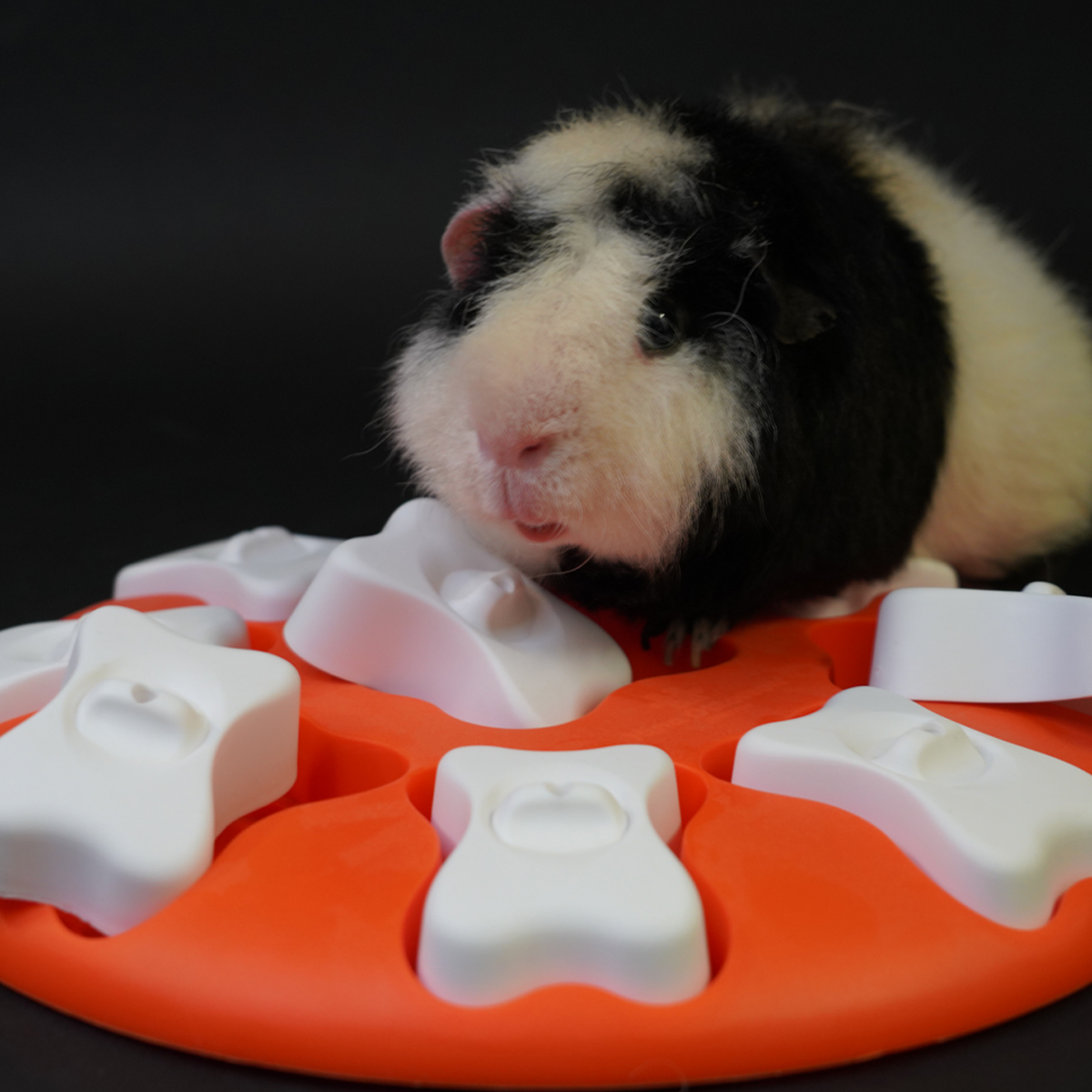 Pick & Find prikkelt de nieuwsgierigheid en het probleemoplossend vermogen van jouw cavia. Vul de vakjes met lekkere traktaties en laat je cavia de witte dopjes optillen om de beloning te vinden.