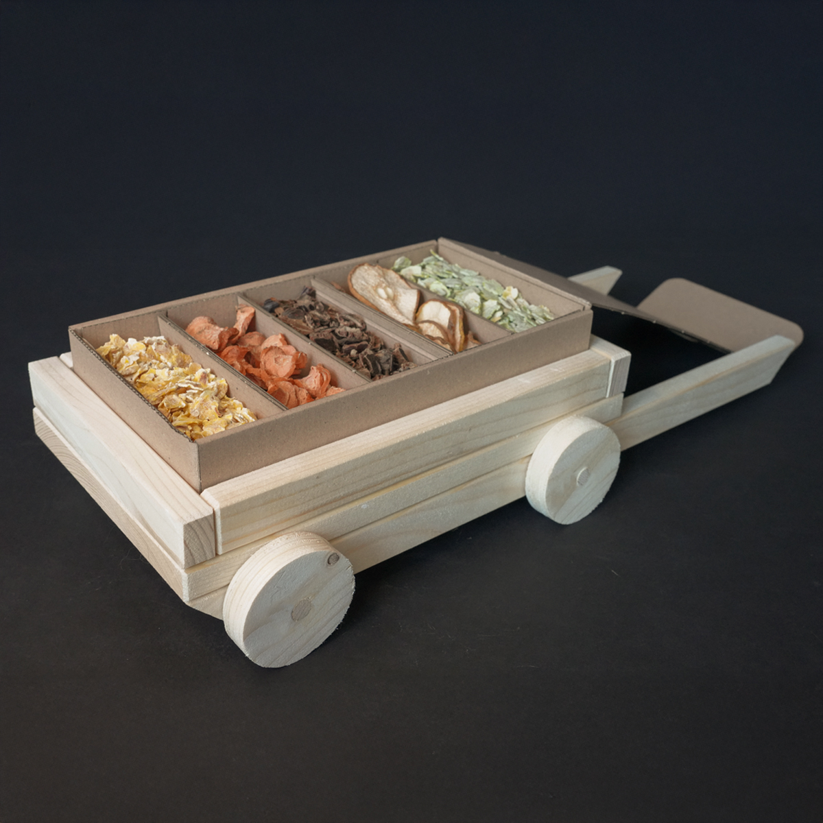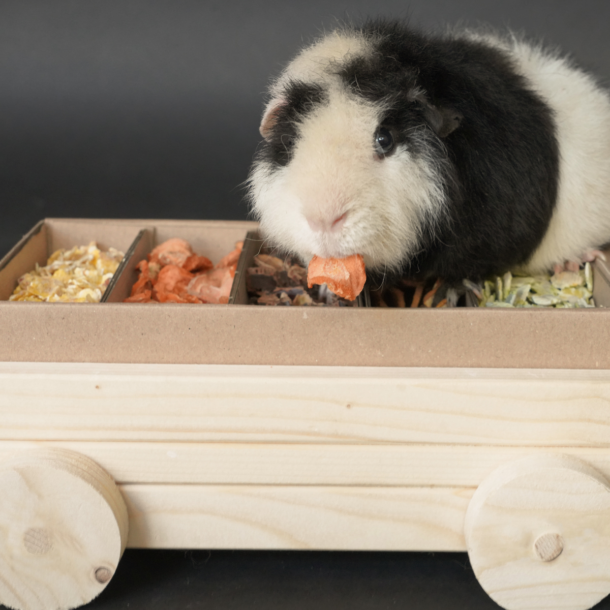 De Snackwagen Prime is een vrolijk houten kar die eten en activiteit op een leuke manier samenbrengt voor jouw cavia.
