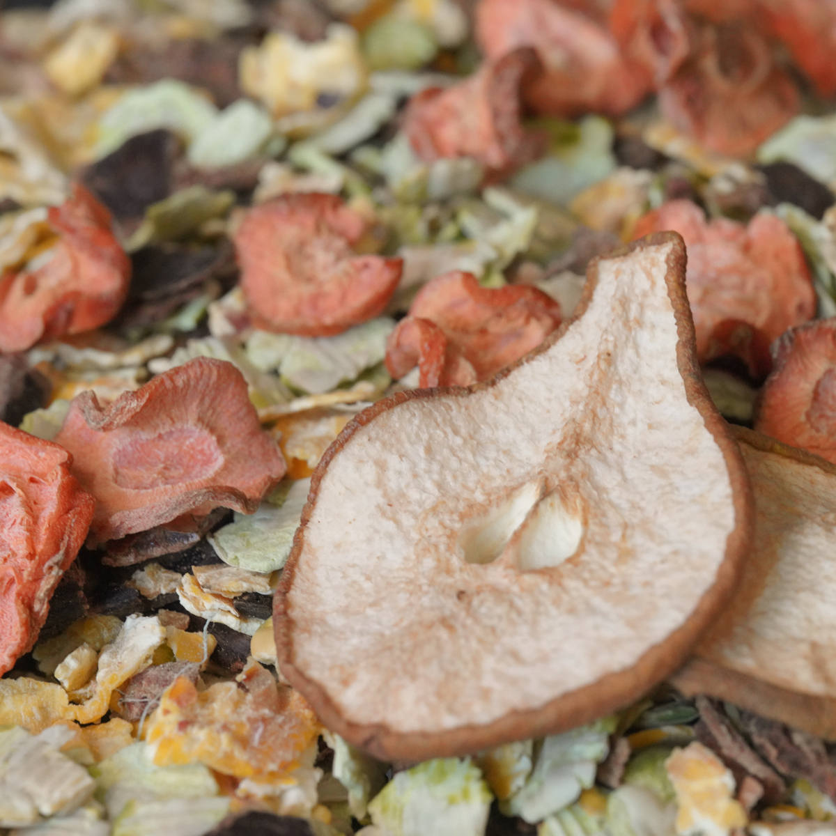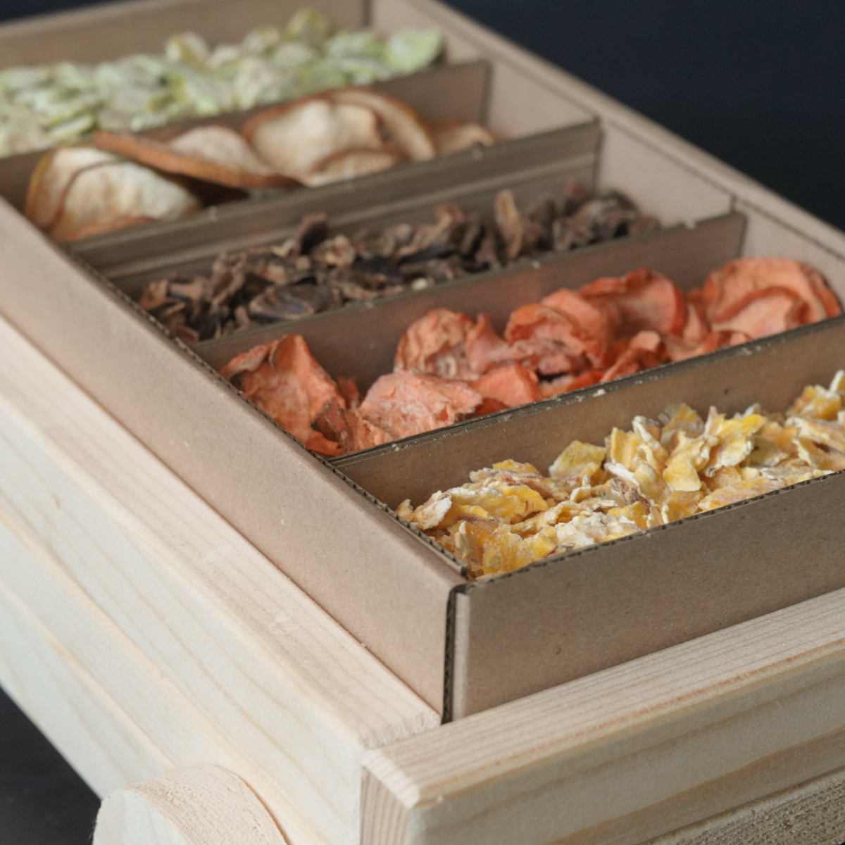 De Prime-editie is rijkelijk voor je gevuld met smakelijke snacks zoals johannesbrood, erwtenvlokken, maïsvlokken, peer- en wortelschijfjes.