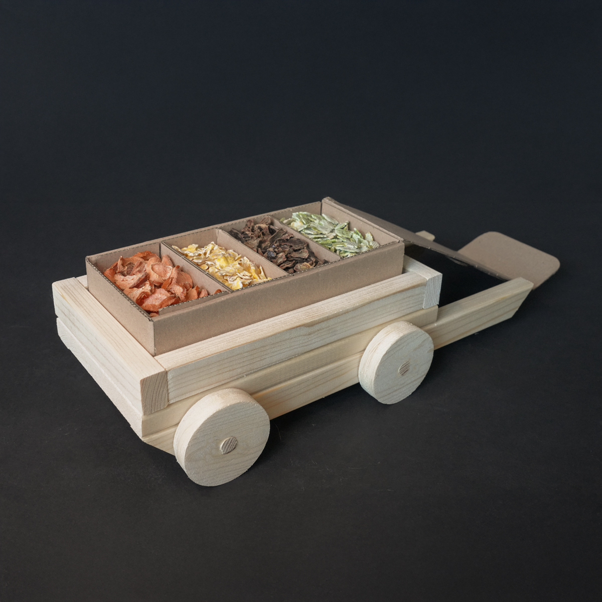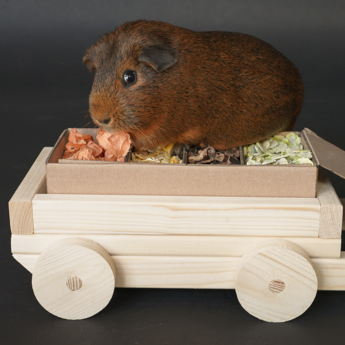 De Snackwagen Prime is een vrolijk houten kar die eten en activiteit op een leuke manier samenbrengt voor jouw cavia.