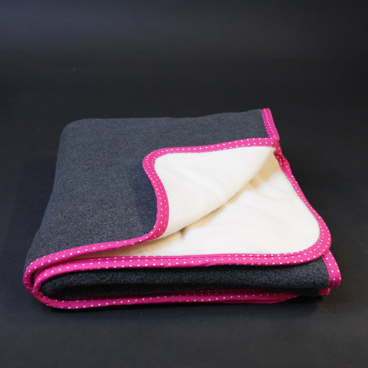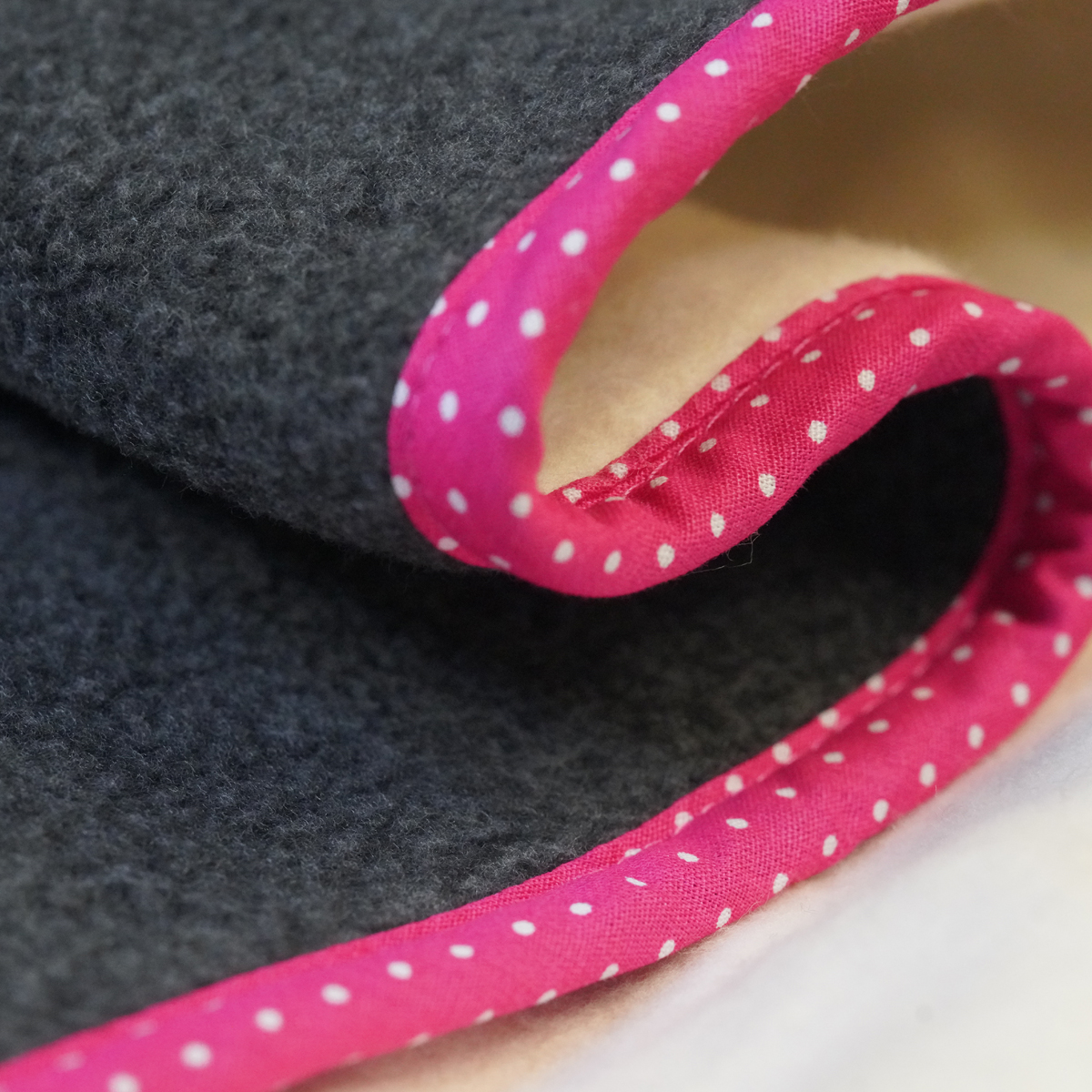 Deze mat is afgewerkt met een roze bies.