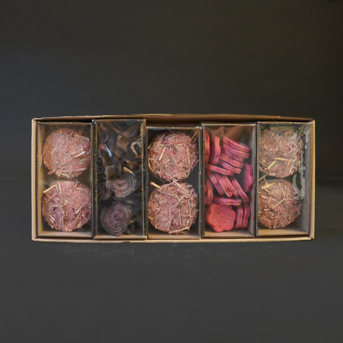 De Ruby box is een heerlijke snackbox voor jouw cavia! Gevuld met 5 natuurlijke snacks uit onze eigen keuken. Met o.a. rode biet hooikoeken en gedroogde rode biet.