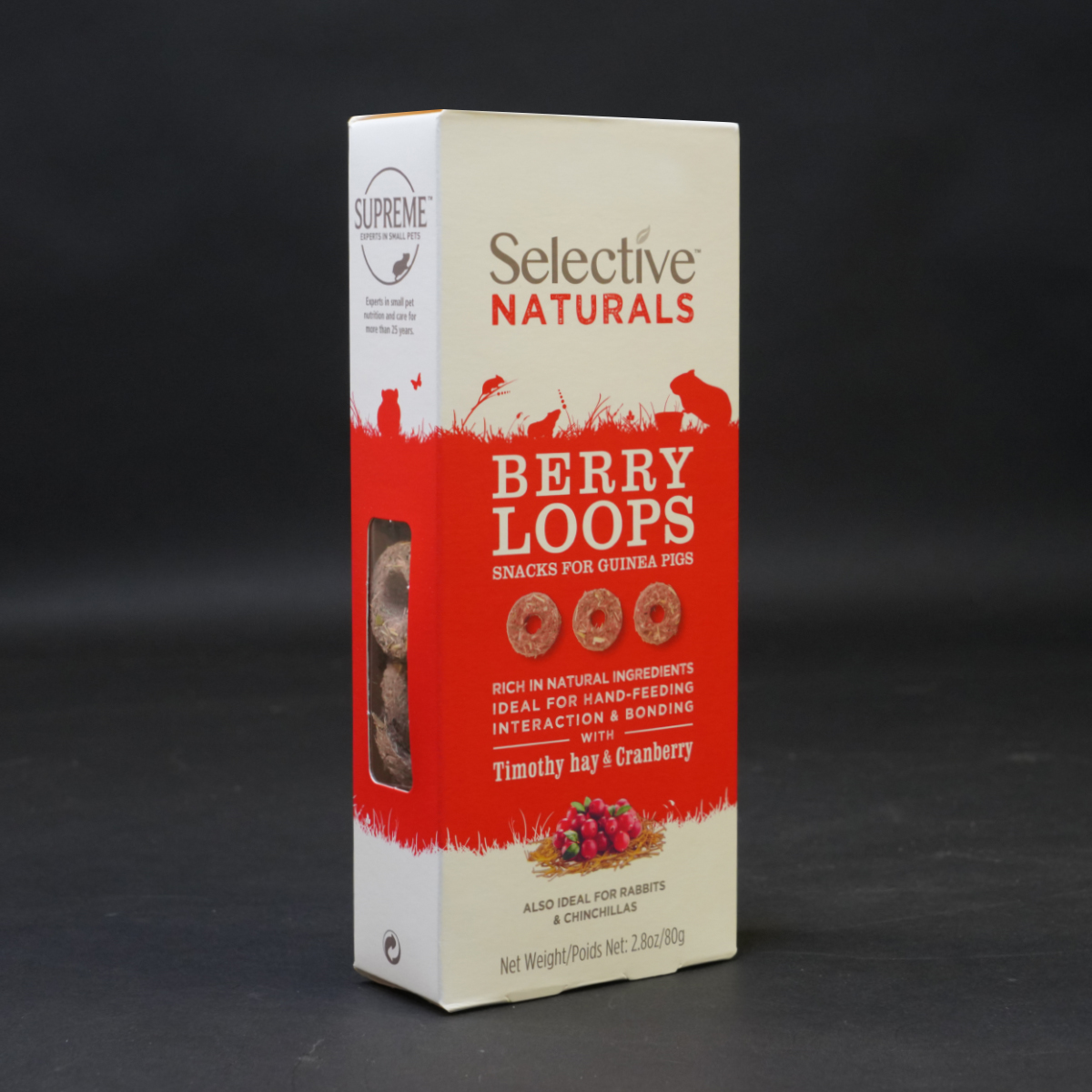 De Berry loops zijn een vezelrijke snack met natuurlijke ingrediënten, zoals Timothy hooi en cranberry. Een gezond tussendoortje voor jouw cavia!