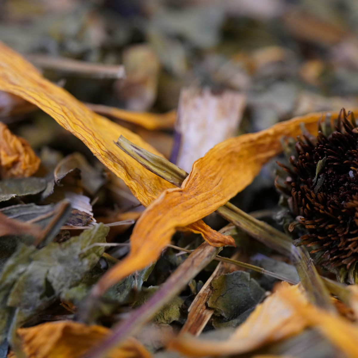 Deze smakelijke kruidenmix is een combinatie van Rode zonnehoed (echinacea) en zonnebloemblaadjes.